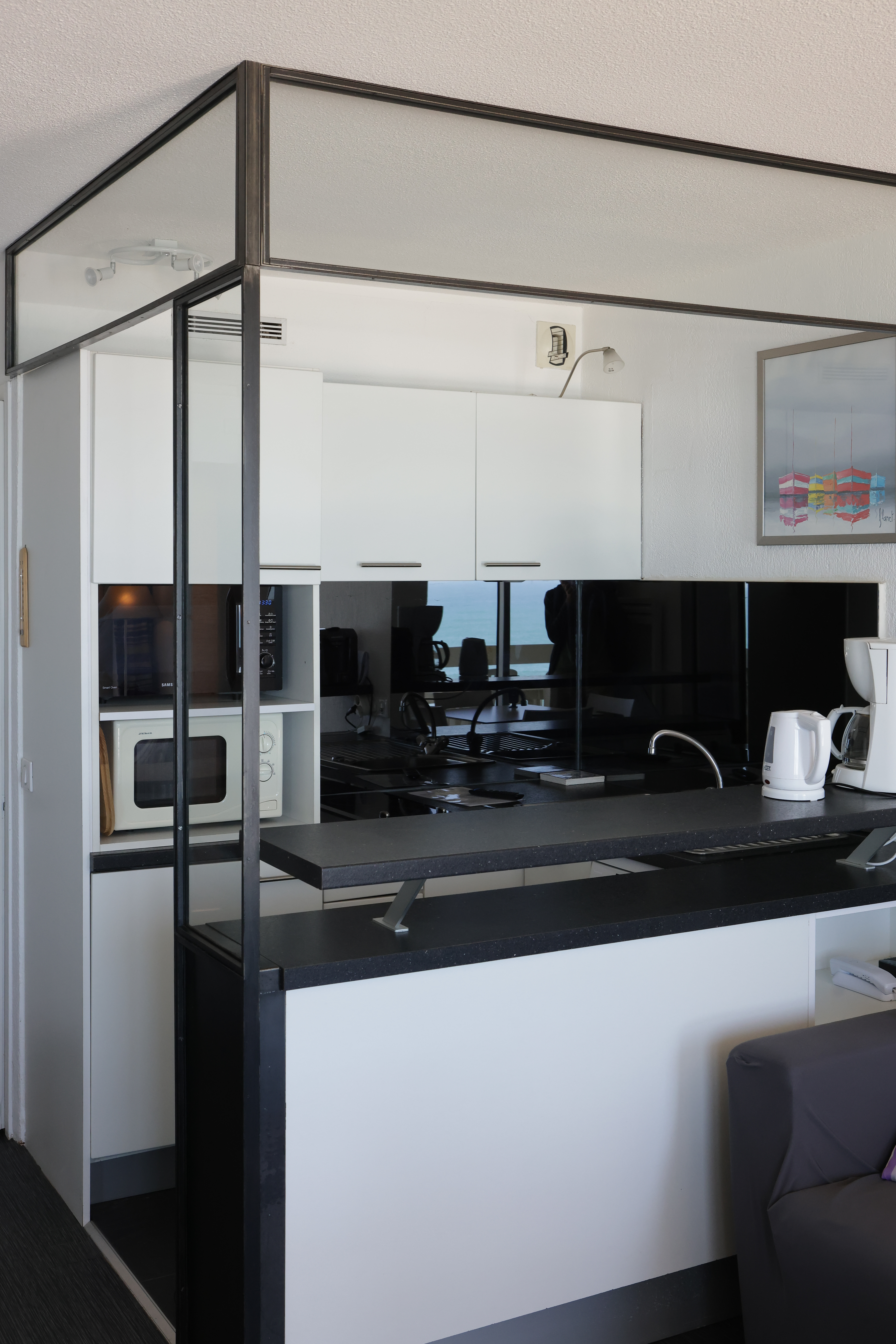 The renovated apartments (about 50m²) situated on the upper levels of the building, ocean view with a living room (sofa bed), one bedroom, 2 flat screen TVs (extra charge), shower room, 2 toilets, a kitchen and a balcony with outdoor table and chairs.