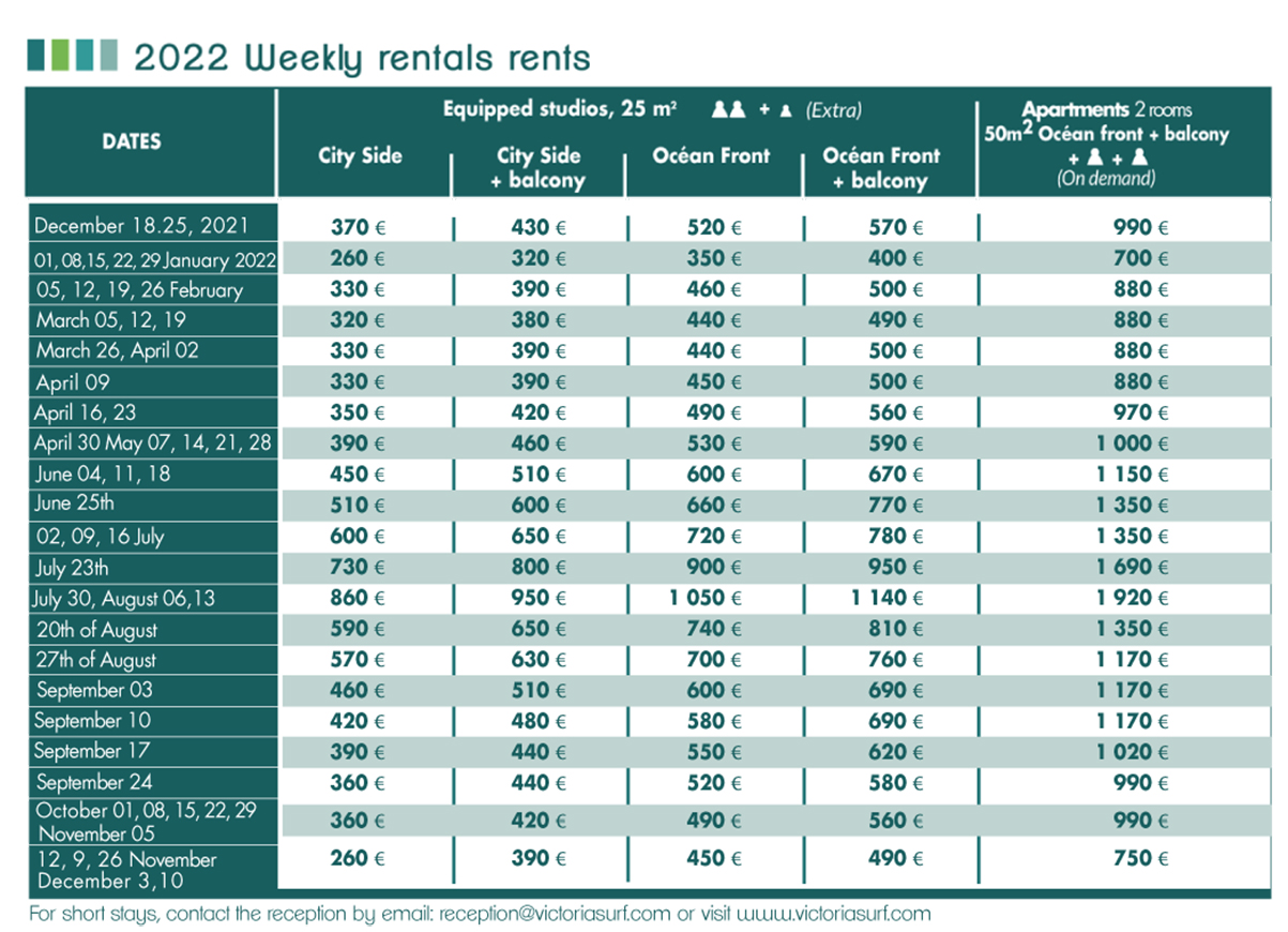 • Booking at the best price guaranteed on our website www.victoriasurf.com in "Book online" or by phone at 05.59.22.27.28.